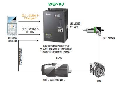 油壓驅動技術是目前射出成型機使用最廣泛的驅動控制方式,具有功率重量比大、壓力和流量控制佳、壽命長及易維護等優(yōu)點;而交流伺服馬達驅動技術則具有響應快、精度高、恒轉矩等優(yōu)點。臺達VFD-VJ系列油電伺服驅動器利用交流伺服馬達驅動的油壓系統(tǒng),將伺服驅動技術、馬達技術與油壓技術結合,且以精確的壓力與流量控制,消除高壓節(jié)流的能源損耗,將射出成型機油壓驅動技術再度創(chuàng)新。此外,臺達在倡導綠色設計的理念及領先的環(huán)保技術上,亦提升了產品綠色制造的技術水平,為客戶創(chuàng)造更多價值。