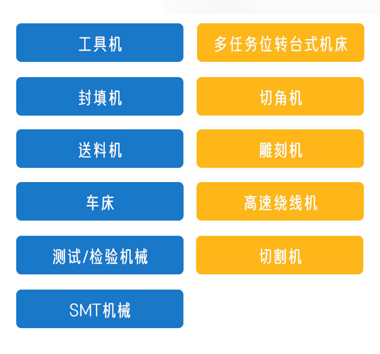 工具機、多任務(wù)位轉(zhuǎn)臺式機床、封填機、切角機、送料機、雕刻機、車床、高速繞線機、測試/檢驗機械、切割機、SMT機械